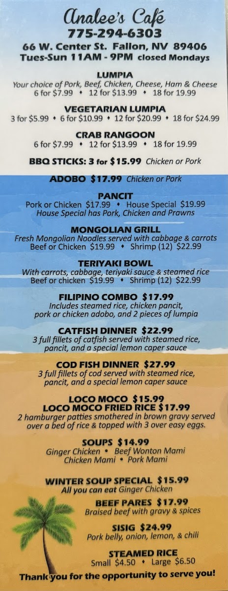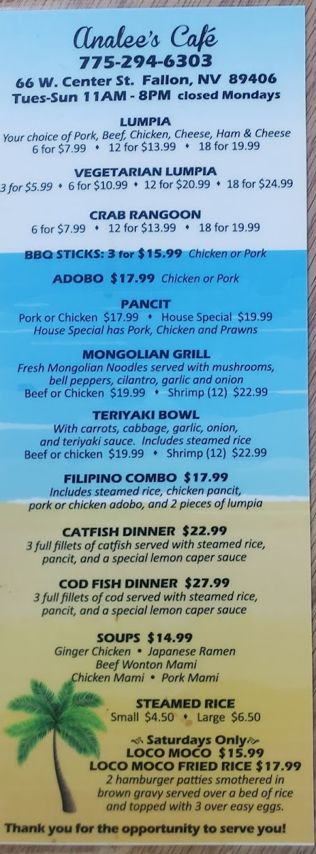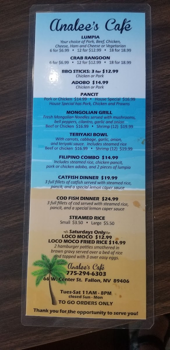 Welcome to Annalee's Cafe, a hidden gem nestled in Fallon, NV, where authentic Filipino cuisine flourishes under the loving guidance of a husband-and-wife team. The atmosphere is inviting, making it perfect for a relaxed meal with family and friends.